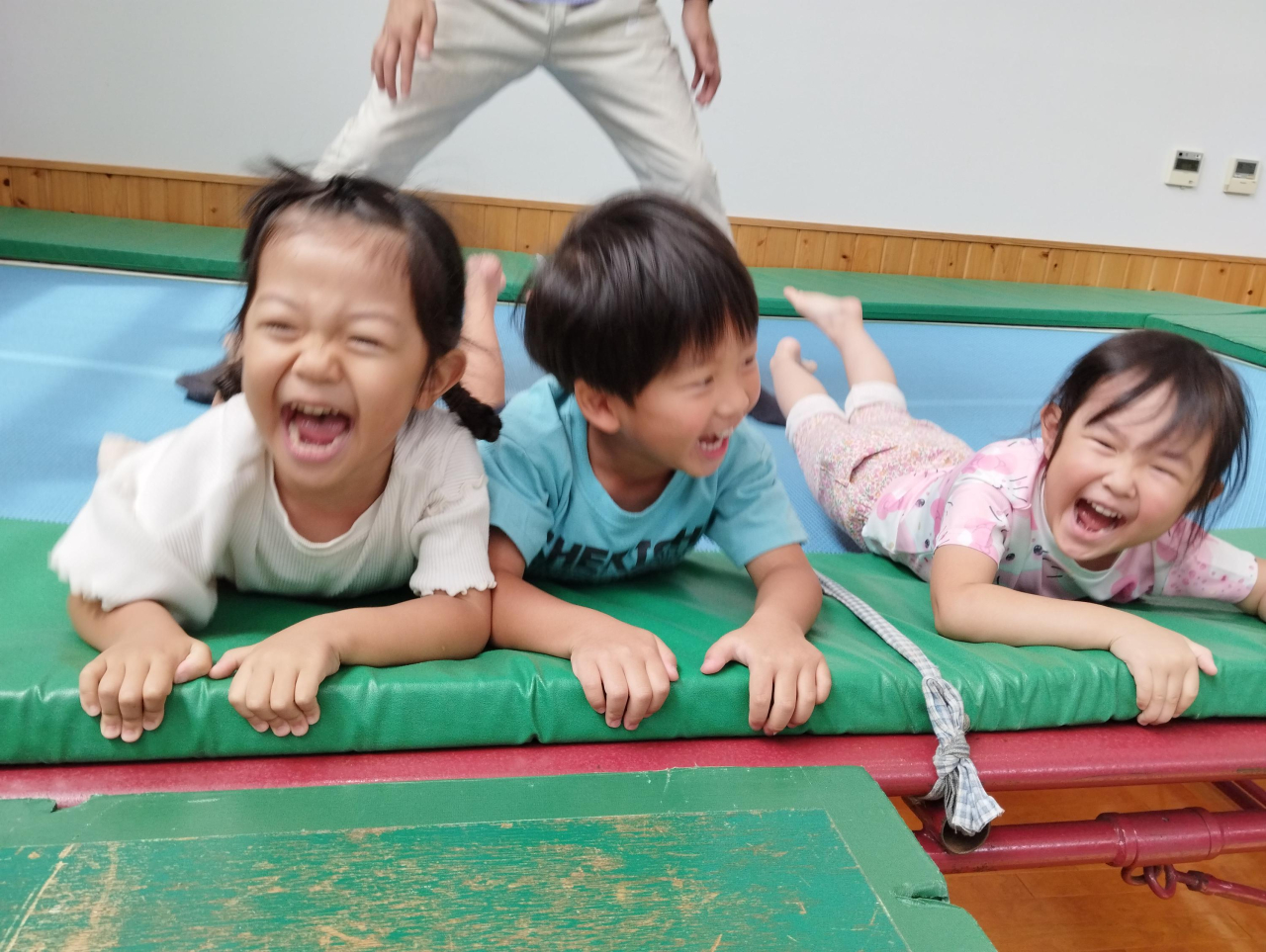 *大きなトランポリンで楽しく体を動かします。トランポリンには運動神経やバランス能力の向上だけでなく脳と体が連動し