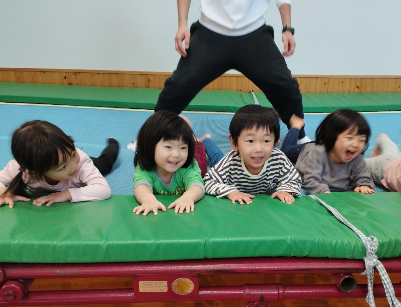 *大きなトランポリンで楽しく体を動かします。トランポリンには運動神経やバランス能力の向上だけでなく脳と体が連動し