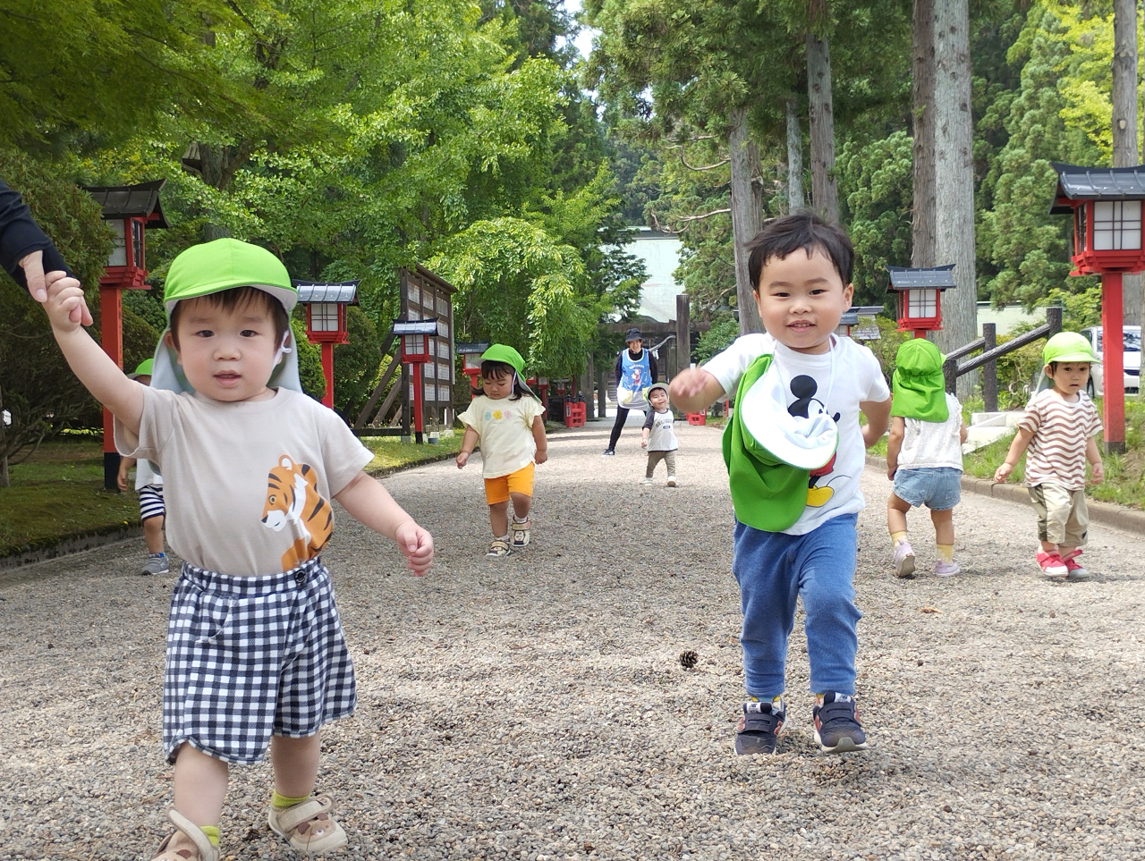 大館神明社の境内の中にあるこども園です。自然一杯の境内はとても安全で子ども達の大好きな遊び場であり、学びの場です。